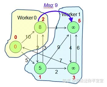 例如,上图假设Worker数是2,那么v0, v2会被分配到Worker0,因为ID对2取模结果为0,而v1, v3, v5将被分配到Worker1,ID对2取模结果为1;