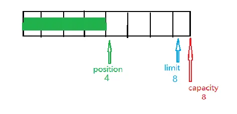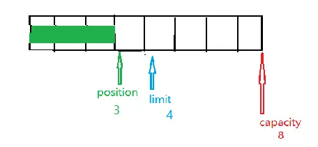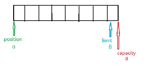 1、为通道新建一个8个字节缓冲区,则最大容量capacity为8,还可以读写的字节数limit也为8,