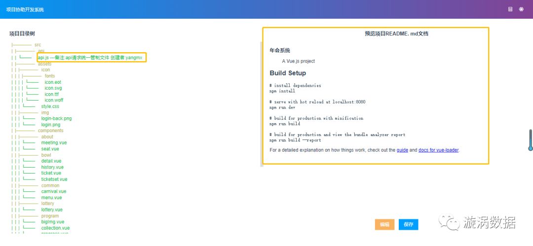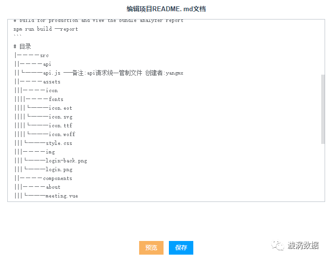 生成文件目录树并且读取文件备注,便于更直观了解文件功能。支持README.md文件的读取编写、预览、写入功能,应对在代码不断迭代开发中,随时随机更新README.md文件,无论你是刚入项目还是接盘别人的功能都能在README.md中或者在托管工具界面快速了解整个项目全貌。