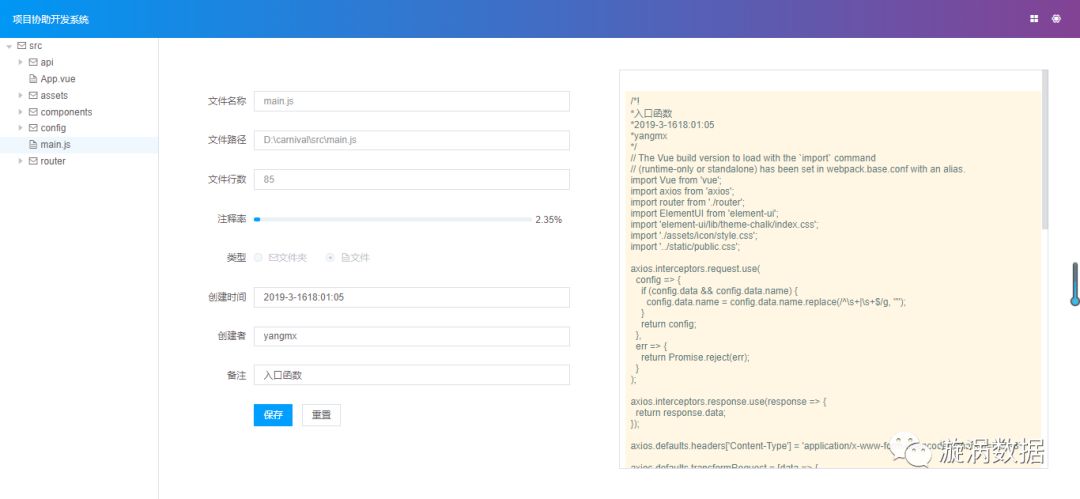 随机开始处理几点问题核心,首先统计开发文件行数来监督一个文件上千行代码造成的代码过于聚合;其次根据html、javascript、css注释规范用正则表达式统计注释行数来计算注释率;编写界面话备注文件功能统一管制文件备注风格,增强开发文件可读性。当然也加了配置功能,包含针对文件显示的过滤规则,如:只读取.js和.vue文件进行监督查看处理;读取自定义文件路径下文件;配置文件顶部备注规范。