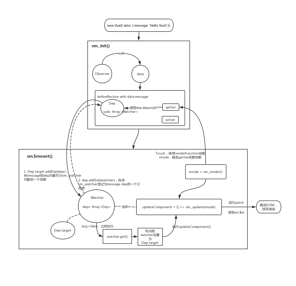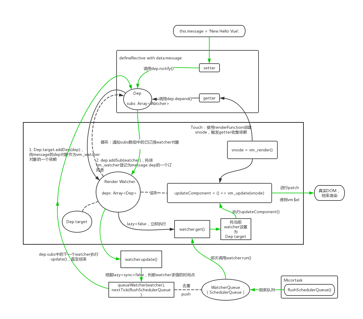 updateComponent函数;因为 lazy 默认为 false,所以会立即执行watcher.get():将Dep.target设置为当前的 watcher 对象,对updateComponent函数求值,即立即调用updateComonent(); vm_render()中通过预编译或者运行时编译得到的 render function,创建对应的 vnode,会触发数据对象中的属性 getter,参照上面的 Dep 处理依赖的行为;vm._update(vnode)中通过 render 得到的最新 vnode 去与 oldVnode 进行 patch 打补丁,得到最终实际的 DOM:vm.$el = vm.__patch__(oldVnode, vnode);