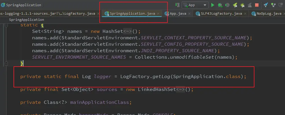 它提供了一个接口供其他日志组件实现org.apache.commons.logging.LogFactory 这里以Spring Boot的demo作为例子 用slf4j做日志管理 当我们启动一个application 我们会先去加载SpringApplication.class 从而加载到它的静态块