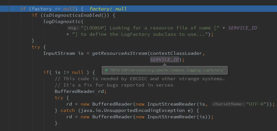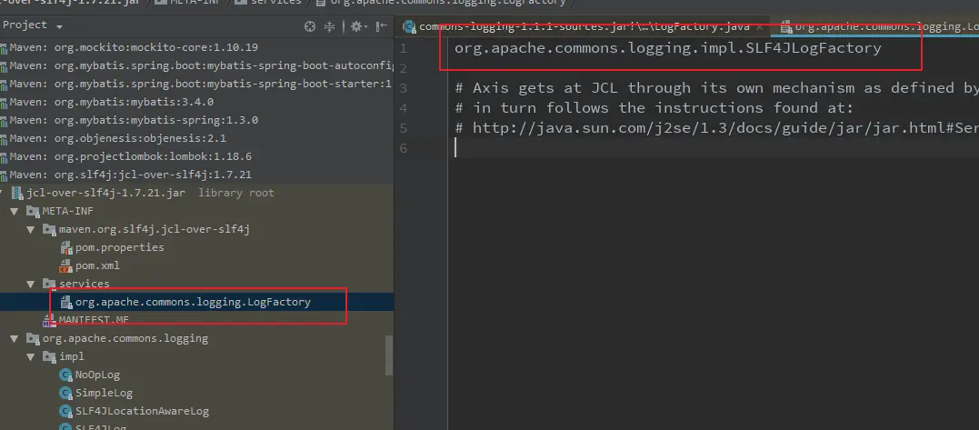 最终利用spi拿到这个SLF4JLogFactory去实现这个org.apache.commons.logging.LogFactory日志接口