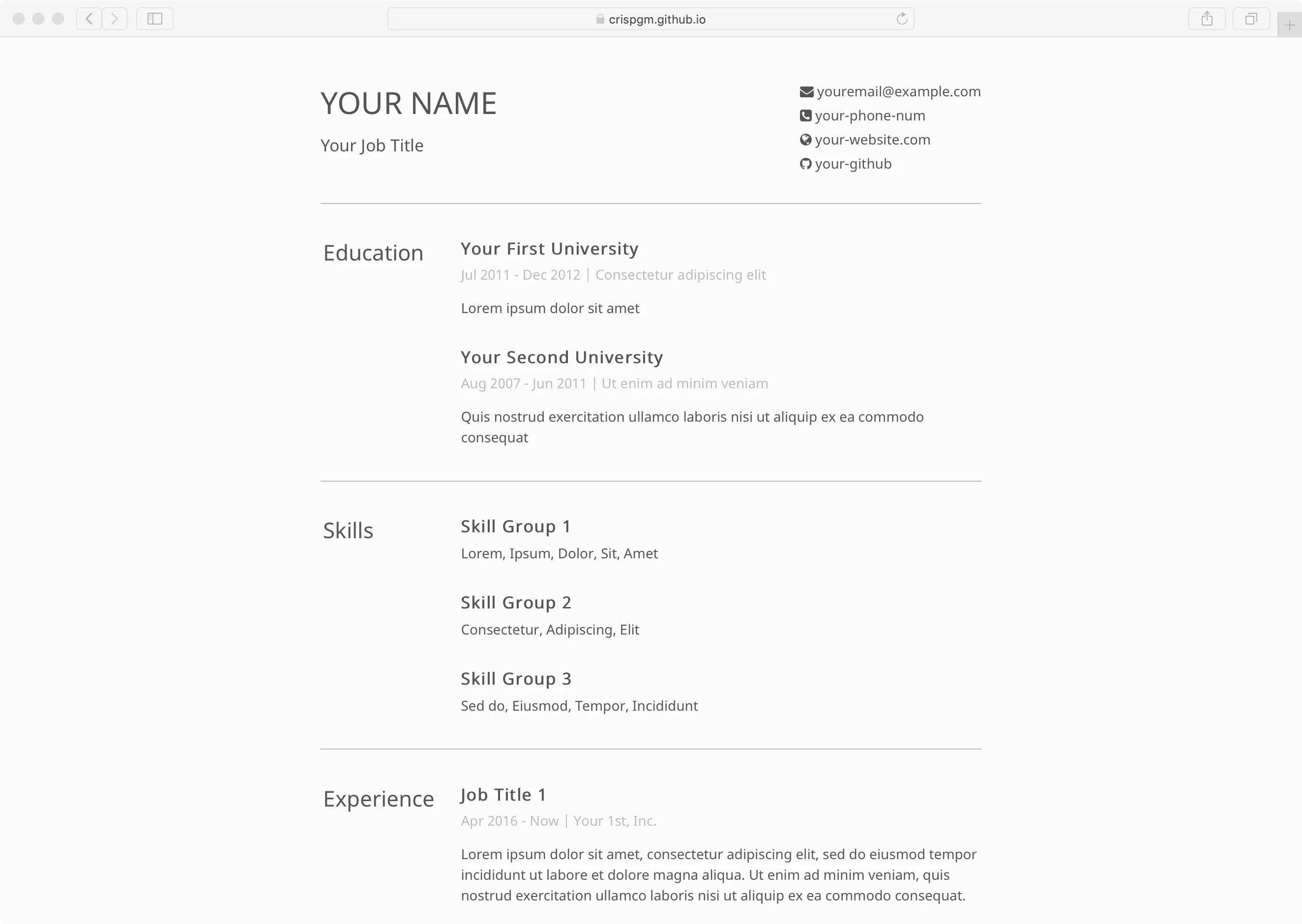 极简风格的响应式简历模板,基于 Jekyll,可以直接部署在 GitHub Pages 上。
