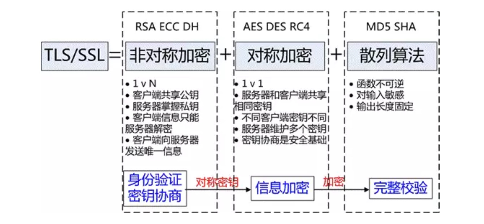 - TSL/SSL主要依赖三类基本算法:散列函数Hash、对称加密和非对称加密,其利用非对称加密实现身份认证和密钥协商,对称加密算法采用协商的密钥对数据加密,基于散列函数验证信息的完整性。!