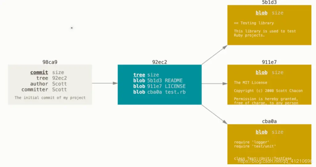 现在,Git 仓库中有五个对象:三个 blob 对象(保存着文件快照)、一个树对象(记录着目录结构和 blob 对象索引)以及一个提交对象(包含着指向前述树对象的指针和所有提交信息)。