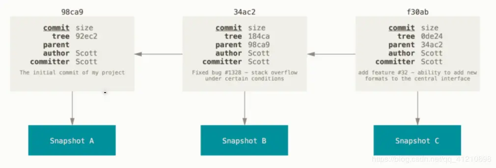 或许你还记得 起步 的内容,Git 保存的不是文件的变化或者差异,而是一系列不同时刻的文件快照。