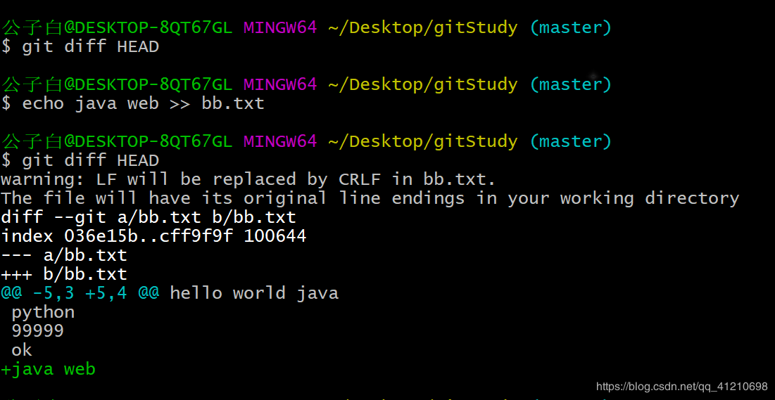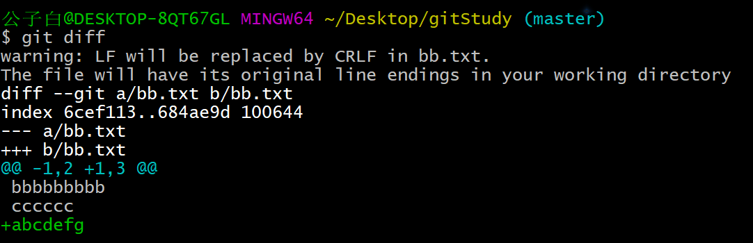 “abcdef”前面的+号,代表该行是新增的。
