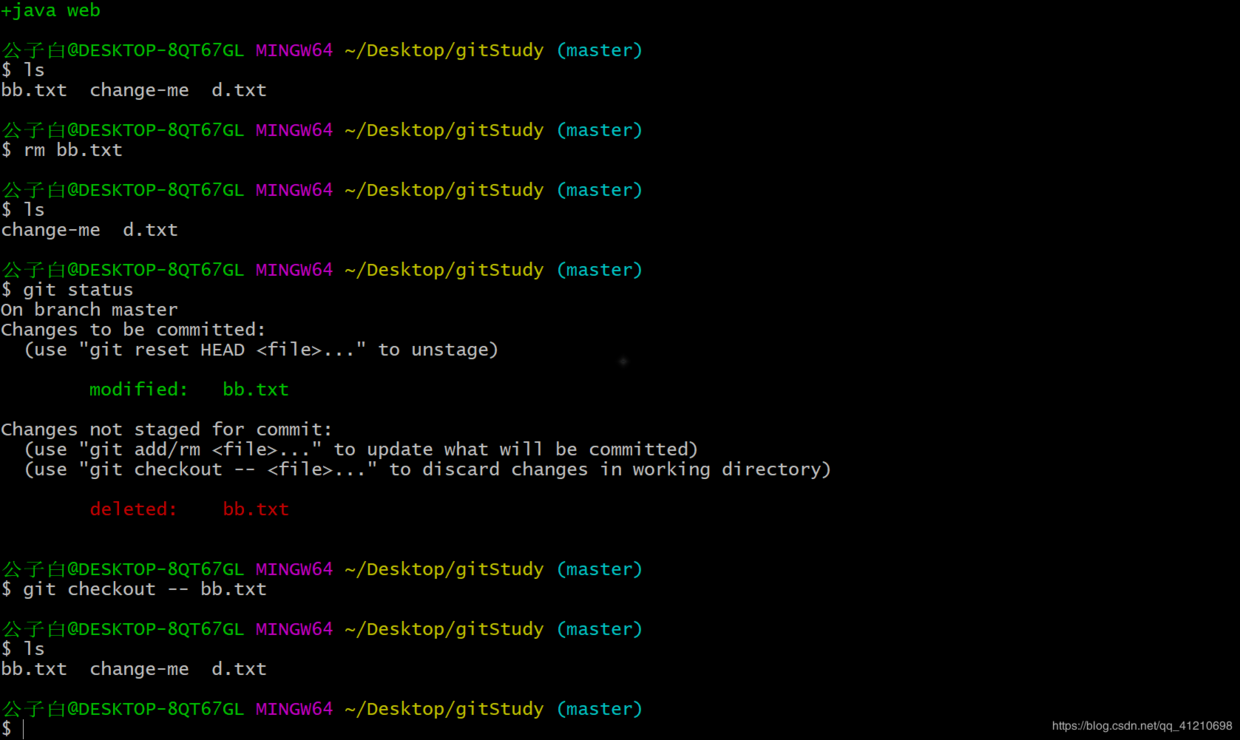 在git的工作区里面,有的时候,不小心改动了某个文件,可以使用git checkout -- file来取消上次改动,原理:把暂存区的数据加载到工作区覆盖掉修改