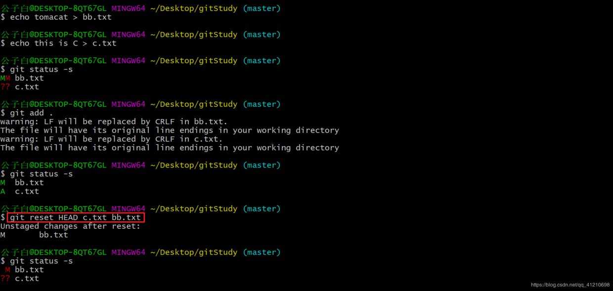 撤回工作区的提交,也就是将暂存区里面,因本次工作区里提交,而修改的blog对象,回退到修改为之前的blog对象。