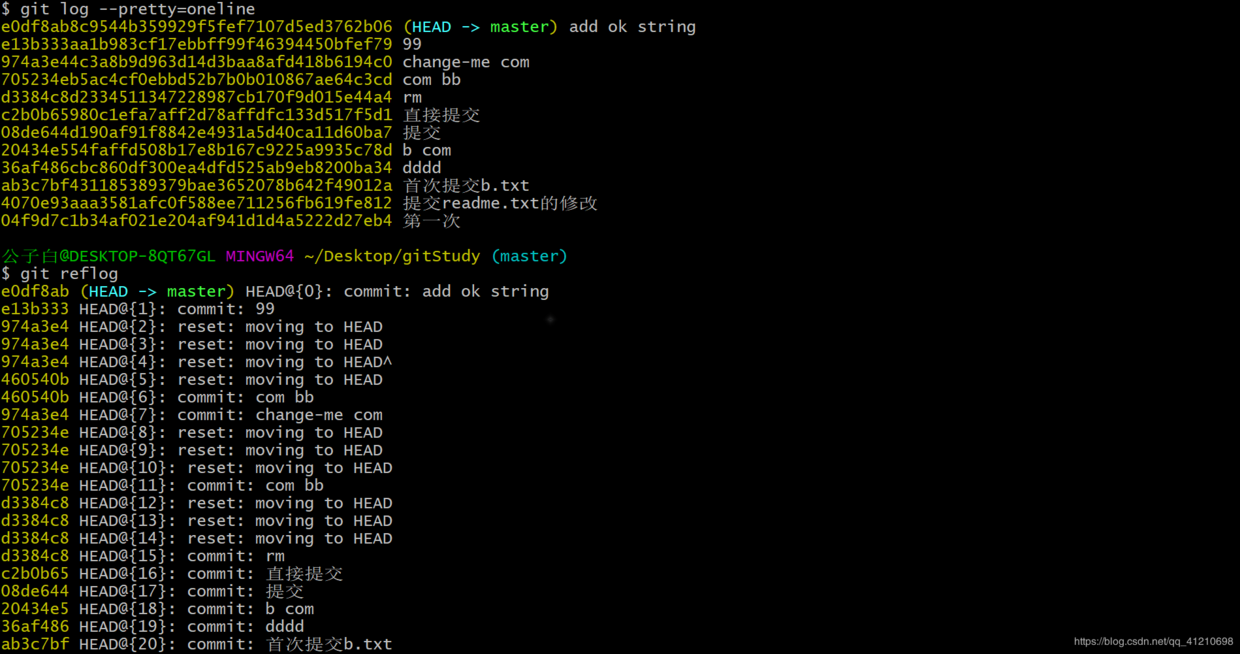 git log只有当前所在版本之前提交的commit记录,git reflog有所有对本地版本库的操作记录