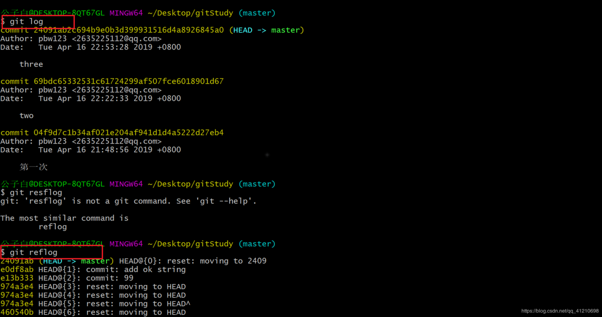 比如,通过git log查看所有提交(思考:git log 跟 git reflog 的区别)