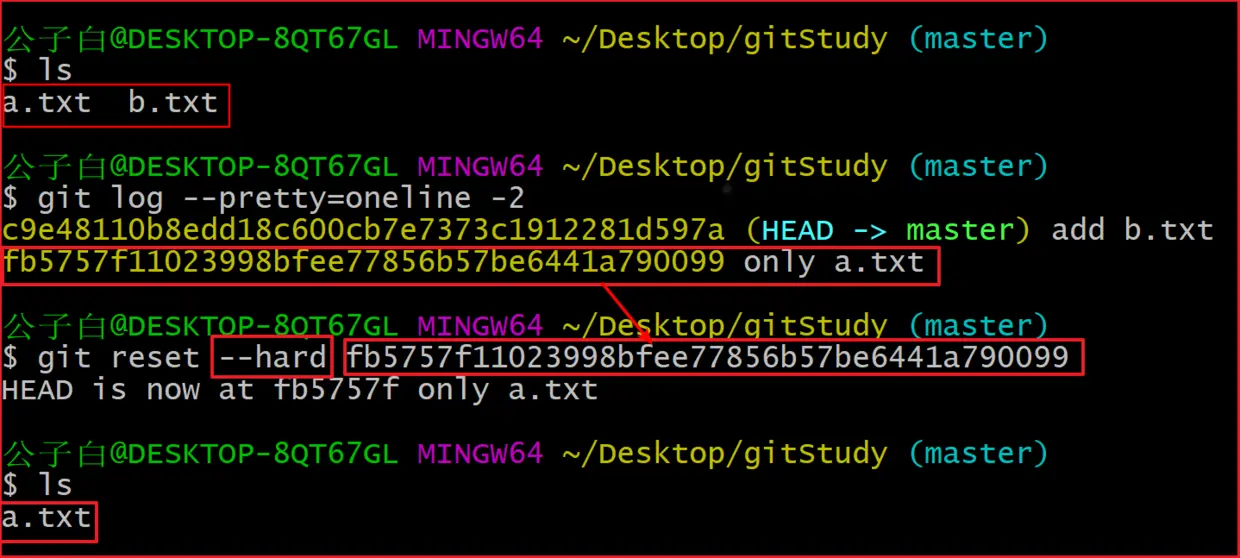 - --hard HEAD 修改暂存区、工作区里面的内容为当前快照里的内容。(这个很危险,曾经踩过坑,电脑的文件丢失了很多,也是导致我决心好好学一学git的原因,慎用)