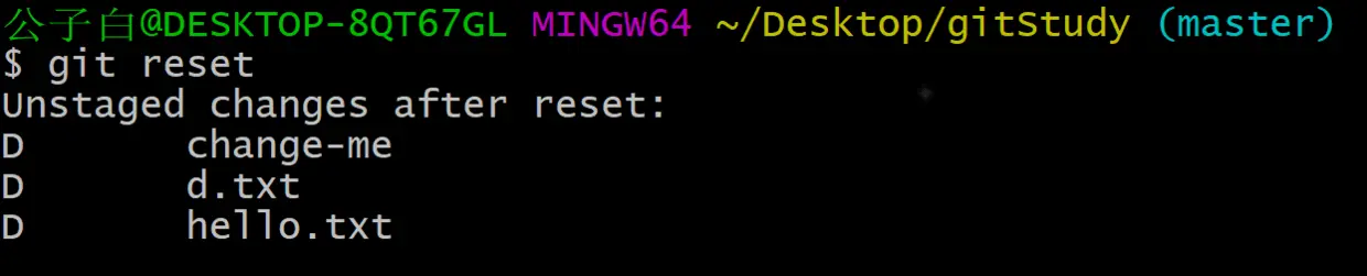 这种情况是工作区没有,但暂存区有,所以提示修改未在暂存区(D表示delete)