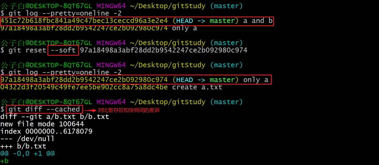 - --soft commitId 修改本地仓库里面的数据为commitId对应快照的数据。(仅改变指向快照的指针指向)