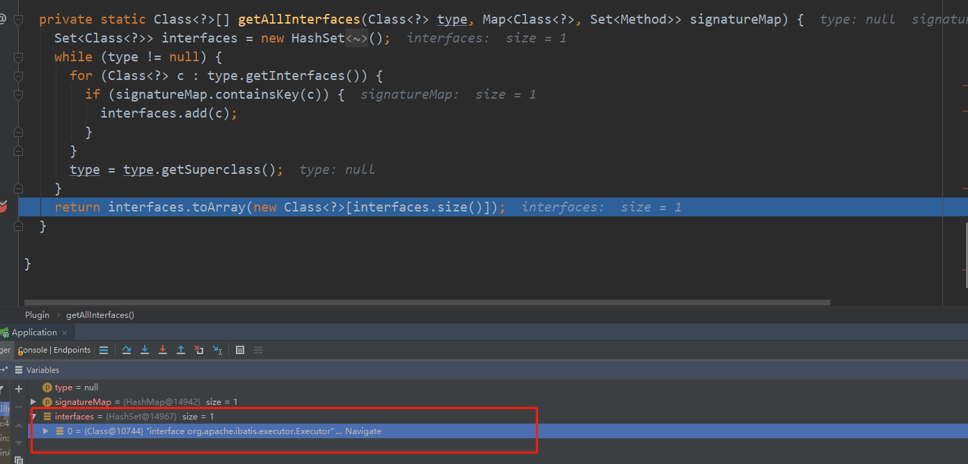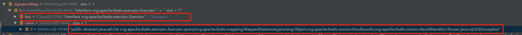 signatureMap.get(method.getDeclaringClass()) 想要获得返回值,method.getDeclaringClass() 的返回值必须是 MyBatis 四大接口中的任意一个的字节码对象,如下图: