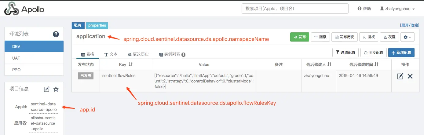 app.id:Apollo中的创建的项目名称,这里采用spring.application.name参数的引用,从而达到服务名与配置项目名一致的效果spring.cloud.sentinel.transport.dashboard:sentinel dashboard的访问地址,根据上面准备工作中启动的实例配置spring.cloud.sentinel.datasource.ds.apollo.namespaceName:Apollo的空间名spring.cloud.sentinel.datasource.ds.apollo.flowRulesKey:配置规则的key名称
