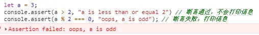 console.assert(a > 2, "a is less than or equal 2") // 断言通过,不会打印信息