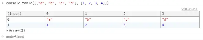 console.table([["a", "b", "c", "d"], [1, 2, 3, 4]])