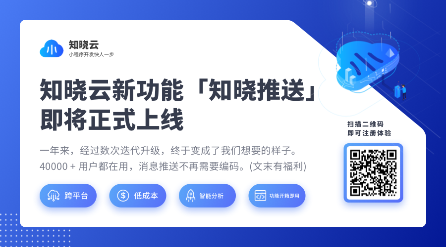 「知晓推送」就针对以上场景做了功能优化,其新推出的智能推送服务可以助力小程序高效匹配目标用户,极大的降低模板消息被封的概率,为小程序业务的稳定运行再上一层保险。