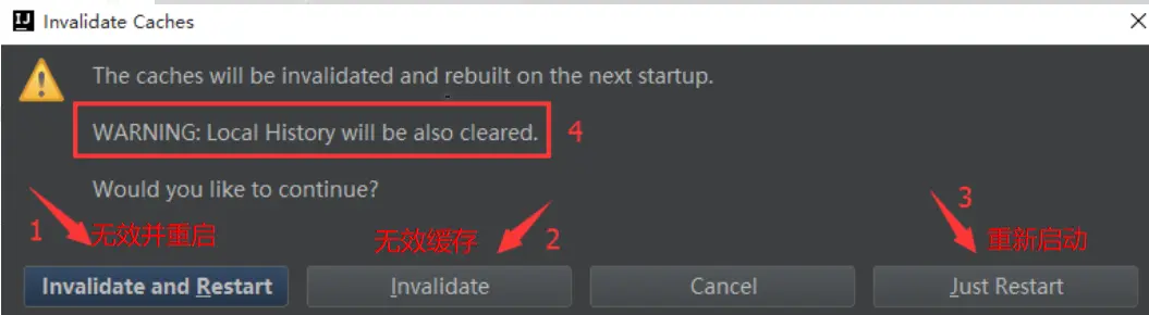 如上图所示,一般建议点击Invalidate and Restart,这样会清理的比较干净。但是,有一点需要注意,那就是:标记 4 所示的WARNING表示如果我们选择清理缓存和索引,那么 IntelliJ IDEA 的Local History也会被一并清理掉。因此,如果我们的项目没有加入到版本控制,而我们又需要项目文件的历史更改记录,那最好备份下该目录,其地址为C:\Users\当前登录的系统用户名\.IntelliJIdea\system\LocalHistory。