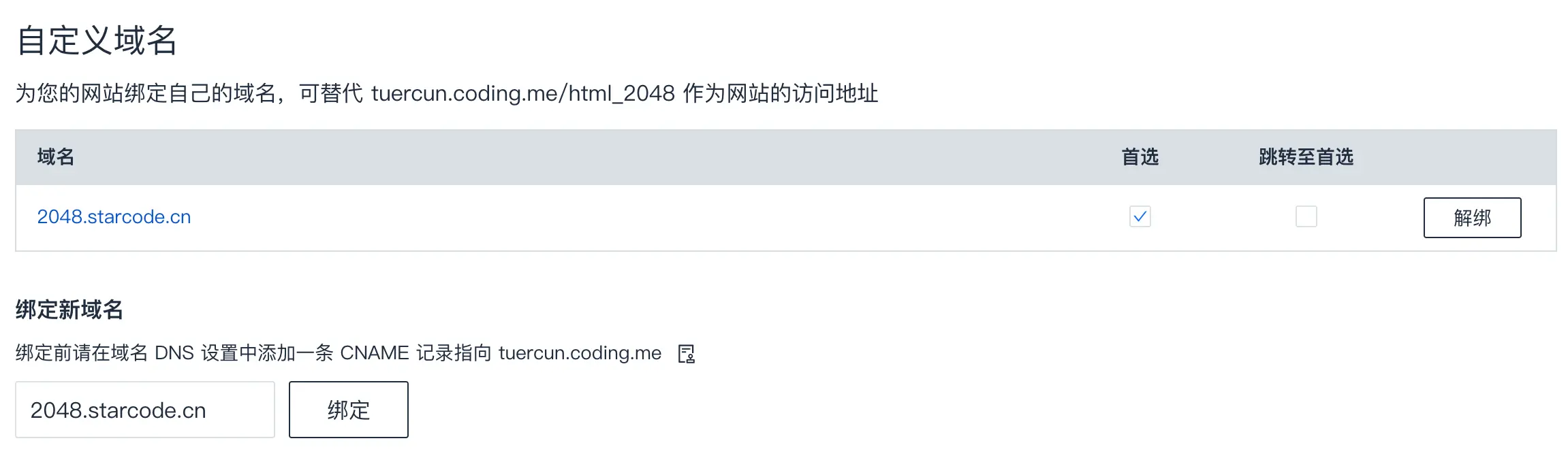 其中 首选 和 跳转至首选 的区别是:前者不会将原先的 tuercun.coding.me/html_2048 废弃,仍可以访问,同时也可以访问自己的域名;后者是强制将原先的访问地址自动跳转到自定义的域名地址上。