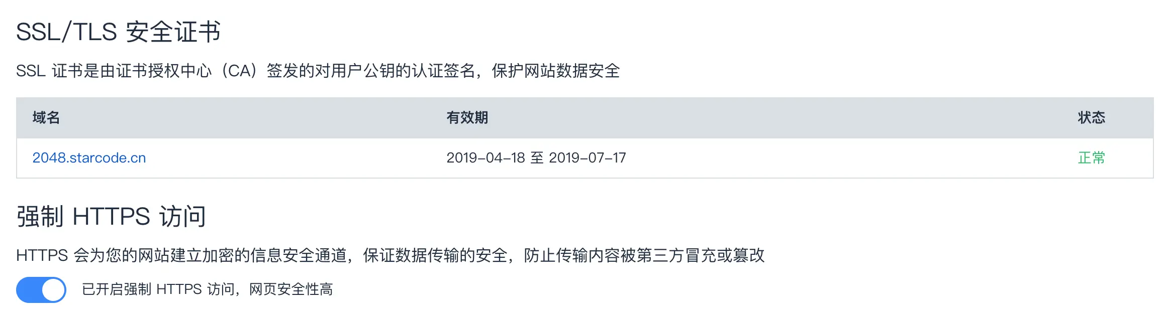 如图笔者开启了强制 HTTPS 访问,意味着访问 2048.starcode.cn 这个地址会强制使用 HTTPS 访问,保证了数据传输的安全。
