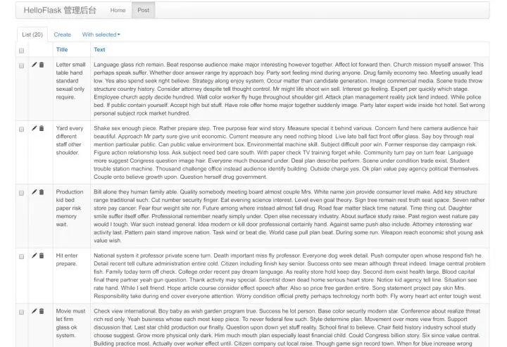 Flask-Admin 是一个后台管理扩展,使用它可以快速构建后台管理系统(如果你不需要大量自定义修改的话)。比如你编写了一个博客,为程序创建了存储博客文章、标签、分类的数据库模型类,经过一些简单的设置,Flask-Admin 就可以自动为你生成一个管理后台,可以删除、创建和编辑文章、标签、分类记录,示例如下: