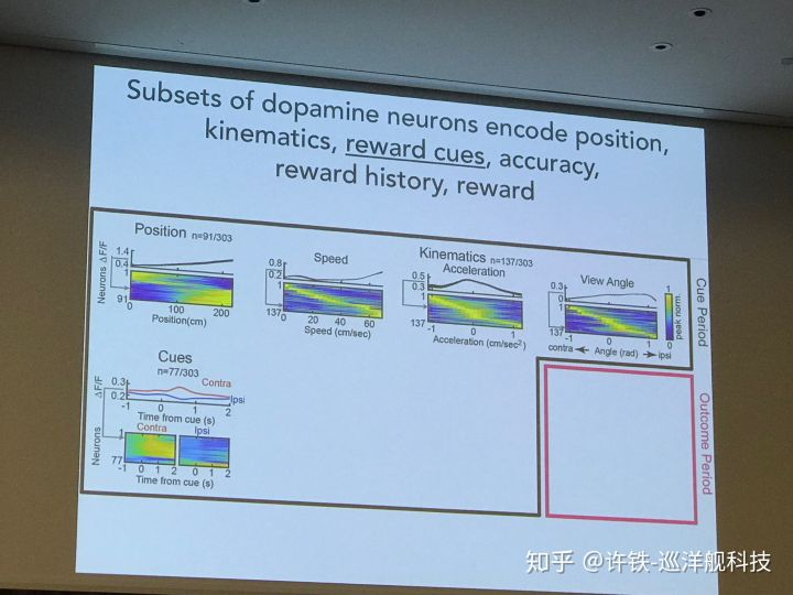 多巴胺神经元和回路是计算神经科学和强化学习的热点问题, 它与我们的一切行为有关, 影响我们的喜乐哀愁。 dopamine的经典理论被认为传递对未来奖励的预期信息和真实奖励的差距, 这恰好对应强化学习理论的TD误差。 后来人们发现这个想法太简单了。 一些新的结果指出dopamine神经元作为一个数量巨大的群体, 编码的信息不仅包括奖励信号, 还有和奖励有关的的信号特征,比如颜色,物体的运动方向。生物系统为什么这样选择自己的强化学习算法, 非常值得探讨。