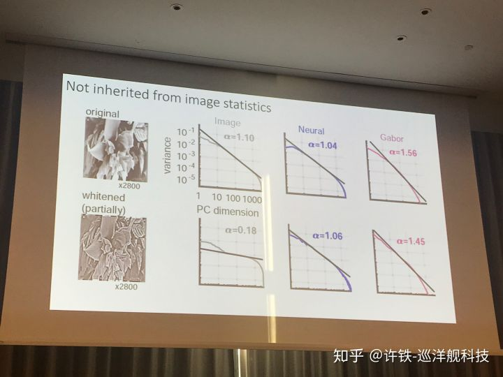 这组实验让小鼠不停的观测从自然环境中随机抽取的图像样本(nature image), 然后我们记录视皮层的神经活动, 并通过PCA等降维手段来观测神经表征里的维度。 首先, 我们最终得到的结果是我们的生物神经网络确实具有无穷多(和图像的总数一样多)的维度(所以需要无穷多神经元表达), 这是由于自然环境中的物体太丰富了,自然信息的维度可以是接近正无穷, 这也是为什么我们的脑内需要这么多的神经细胞。
