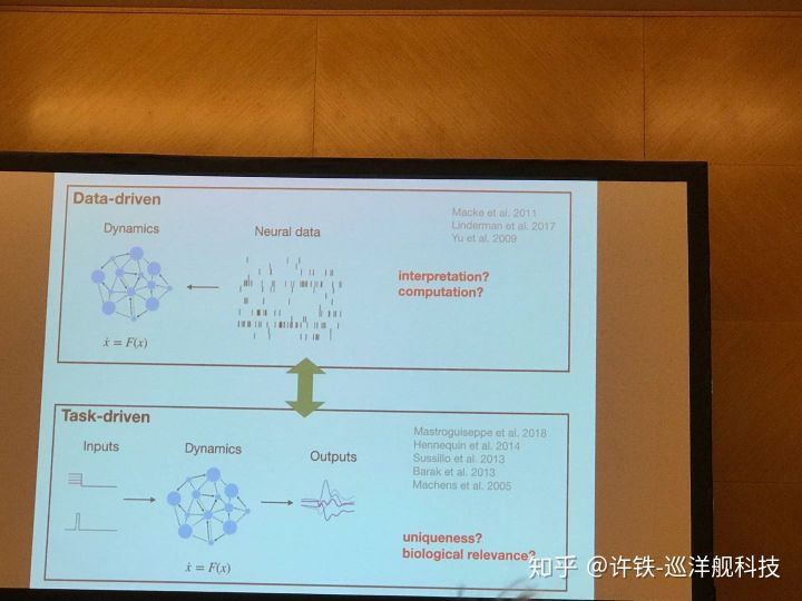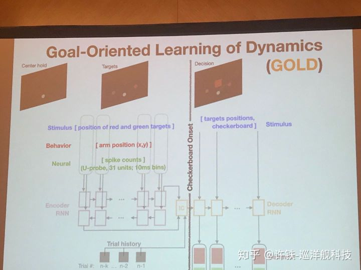 另一些讨论围绕RNN,本次会议提到了一个GOLD模型 (Daniel O'shea Stanford)。用RNN可以学习执行一个任务,比如决策,但是以往我们不知道RNN的神经元活动和真实的关系。 现在, 执行任务的同时我们用类似刚刚的方法让它拟合真实的实验数据(神经元活动), 由此我们认为,得到的RNN就是我们脑网络的缩影,可以分析出大脑信息流动的基本原理。 这类工作应该对构建大规模脑网络非常有帮助。