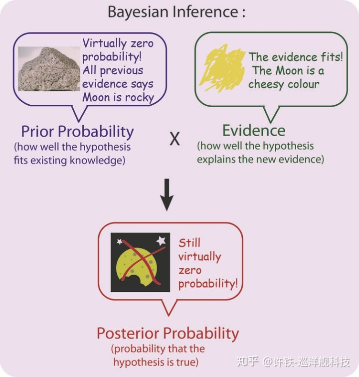 2, 贝叶斯的家长: 孩子我们去不了天空, 但是我们可以想象下我们生活中的经验, 然后查看一下教科书。 首先, 教科书里说, 到目前为止,天空中发光的99.99%是石头。 然后, 再联想下生活经验, 如果是奶酪, 那么它确实是黄灿灿的发光, 因此生活证据显示, 月亮是奶酪的假设并不违和。 那么把两个综合一下, 通过一系列后面会说的公式, 你给出孩子它的观测结合书里的知识的合理性概率: 月亮是石头的概率99.9%。 贝叶斯通过承认我们自身的无知,给不同的假设以调整空间。