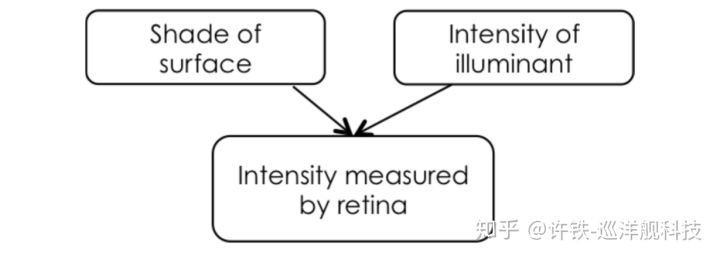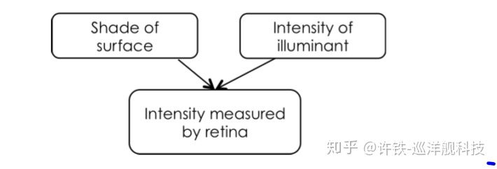 我们来看为什么,颜色事实上光谱决定的, 也是不同频率光的成分大小。 这里我们做个简化,我们只有黑白灰。 大家知道, 其实真实世界的物体本身谈不上颜色, 它只是在反射, 而入射光乘以反射率决定了我们看到的样子。 黑色的物体代表反射率为0, 白色的物体是1, 而中间就是灰色。 但是, 你记住, 你的研究只能检测反射光强,这个反射光强等于反射率乘以入射光强。 如果你的眼睛检测到一个反射光强, 而我们的物体识别问题实际上正是想找到反射率这个特征(它才与颜色相关)。 也就是说,我们的研究遇到一个两难处境。 它所收集的资料反射光强, 既包含反射率, 又包含入射光的信息。 我们得到的是一组反射率和入射光的组合, 那么我们究竟为什么会看到黑白灰的色彩呢? 原因是, 我们的大脑根据先验和似然性, 做了一个贝叶斯推断。 首先, 这里的先验是什么? 我们在自然界中, 往往会根据时间现场的光线强度等对于入射光强做一个估计, 这个经验数值就是我们的先验(在这里最好把这个经验数值想成一个以最可能的值为中心的高斯分布)。 因为日常生活吗, 总归是在那几种光线下。然后根据刚刚的乘法法则(这个相当于似然性, 你有了反射度和入射光强, 可以完全确定你眼睛的检测光强,一个狄拉克函数), 你可以推出反射度的后验分布, 这个分布的峰值, 正是你最可能看到的颜色。