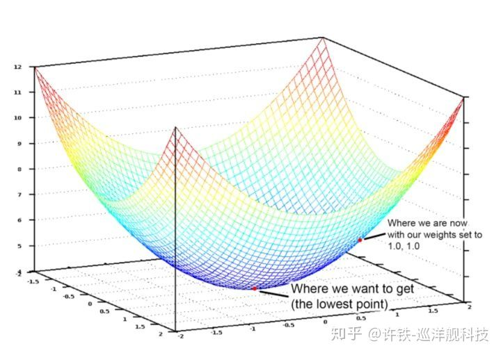 整个机器学习依靠的寻求最优的方法就是梯度优化, 这个方法相比进化算法, 更具方向性和目的性, 虽然我依然不知道我要寻找的那个最优是什么, 但是我每往前走一步, 都希望最大程度的接近它, 或者说贪婪的接近它, 这个时候我们就会设置一个目标函数(类似于进化算法里的适应度), 然后我们让参数顺着最快速减少目标函数的方向去自动调整, 如下图。
