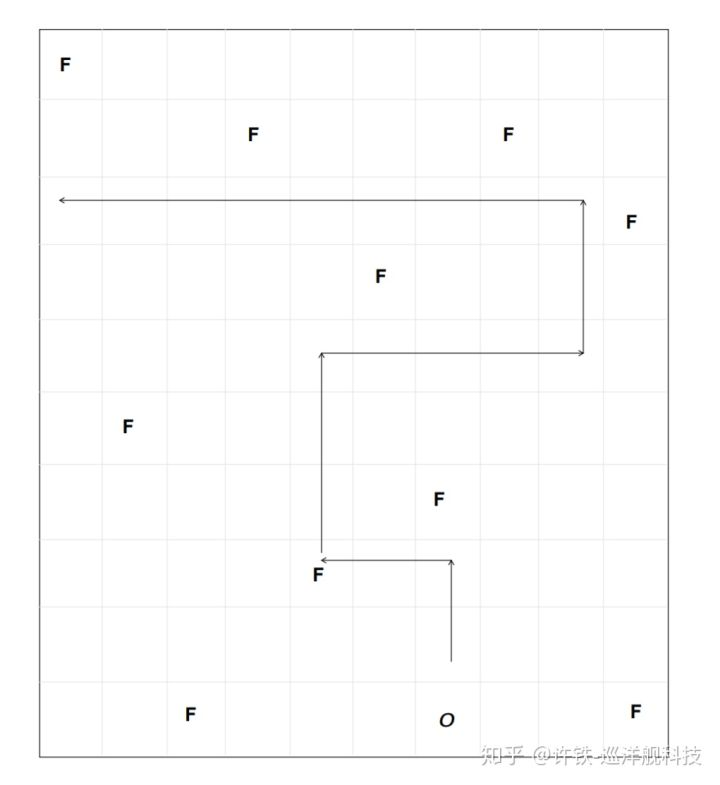 来看如下的儿童游戏: 在一个grid走方格任务里,模拟生物需要在最短的时间里收集足够多的食物(用F代表), 这个生物由一个菜鸟级的神经网络代表。 神经网络接受的输入数据来自周围的食物的方向和距离远近(一种视觉,足以让你找到临近的食物)。 它的行为呢? 直线前进, 向左或向右转动。 神经网络的输出决定它的行为。