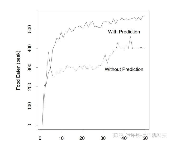 预测这个事情会产生什么效果呢? 通过预测的对错(不停的把自己想到的和最终结果对比), 它会开始进行学习,一个重点在于, 学习的过程只在代系之内, 也就是说比如100轮(一轮就是一次游戏)做一次进化算法的迭代, 那么学习可能是在这100轮里每轮都进行的, 但是学习的结果不会传递给下一代, 就好像你死了, 你头脑里的知识也消失了。 那么随之而来的是什么现象呢? 学习不是就没有意义了妈?