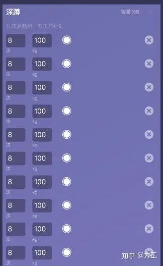 小明做了 10组 深蹲,每组扛着 100kg 的深蹲,每组做 8下,那么他的深蹲训练容量就是:
