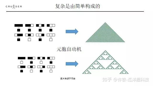 图: 简单规则生成复杂的极好例子, 元胞自动机, 每一步细胞的繁殖和扩散方法一定(左图黑格表述的, 从上一行到下一行的变化法则), 它最后形成的图案就定了, 规则可以很简单, 图案可以很复杂。