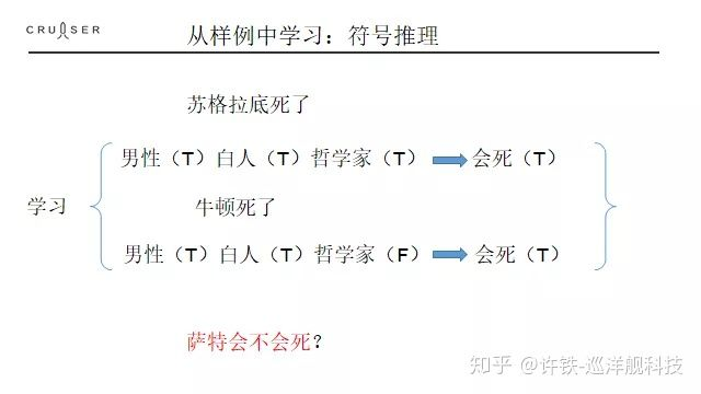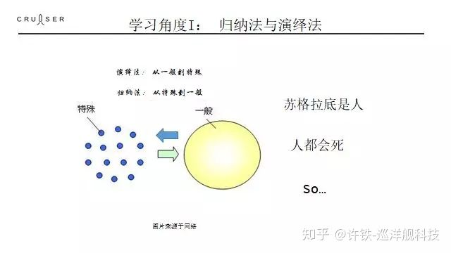伟大的希腊哲学家早就对学习的本质展开过探讨,它们把学习分类为归纳法和演绎法。所谓演绎法, 就是从用一定规则进行推理的过程。 苏格拉底是人,人都是会死的, 因此苏格拉底会死。这就是三段论, 或者称为演绎法的根基。 而真正学习的过程,是这个演绎法的逆过程。我们先知道一个特例,然后通过特例,得到这个“人都是会死的” 知识,再指导自己的行动。 学习是知识在脑子或者机器里面形成的过程, 怎么形成? 这个过程被称为归纳法,也就是根据搜集到的特例比如苏格拉底死了这个事情,来归纳更一般的知识。