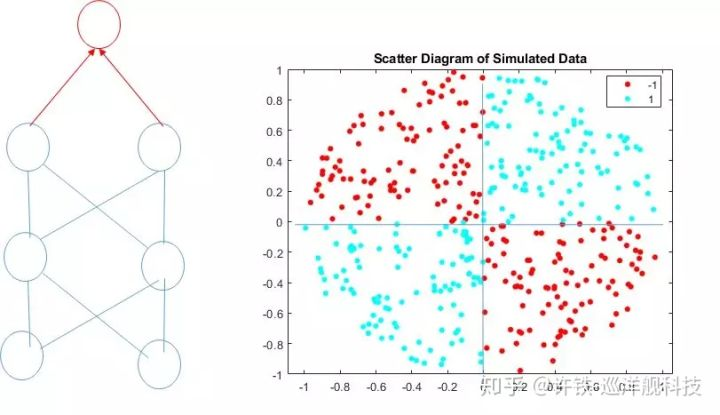 单个的感知机并不能比传统的机器学习多做一丁点的事情, 还要差一些。 但是把很多个感知机比较聪明的联系起来,就发生了一个质变。首先, 每个线性分类器, 刚刚讲过都是一个小的特征检测器, 具有自己的偏好,这个偏好刚好用一个直线表示,左边是yes,右边是no, 那么多个神经元表达的是什么呢? 很多条这样yes or no的直线! 最终的结果是什么呢?我们得到一个被一条条直线割的四分五裂的结构, 既混乱又没用! 这就好比每个信息收集者按照自己的偏好得到一个结论。所以, 多个神经之后,我们还要在头顶放一个神经元, 它就是最终的大法官, 它把每个人划分的方法, 做一个汇总。 大法官并不需要什么特殊的手段做汇总, 它所做到的,无非是逻辑运算, 所谓的“与”, “或”, “非”, 这个合并方法,把哪些被直线分开的四分五裂的块,就可以得到一个非常复杂的判决结果。 你可以把大法官的工作看成是筛选, 我们要再空间里筛选出一个我们最终需要的形状来, 这有点像是小孩子玩的折纸游戏,每一次都这一条直线, 最终会得到一个边界非常复杂的图形。 其实这里面做的事情, 正是基础的逻辑运算, 一个简单的一层神经网络可以执行与或非这些基本的逻辑操作。事实上它的本质就是把简单的特征组合在一起形成一些原始的概念。