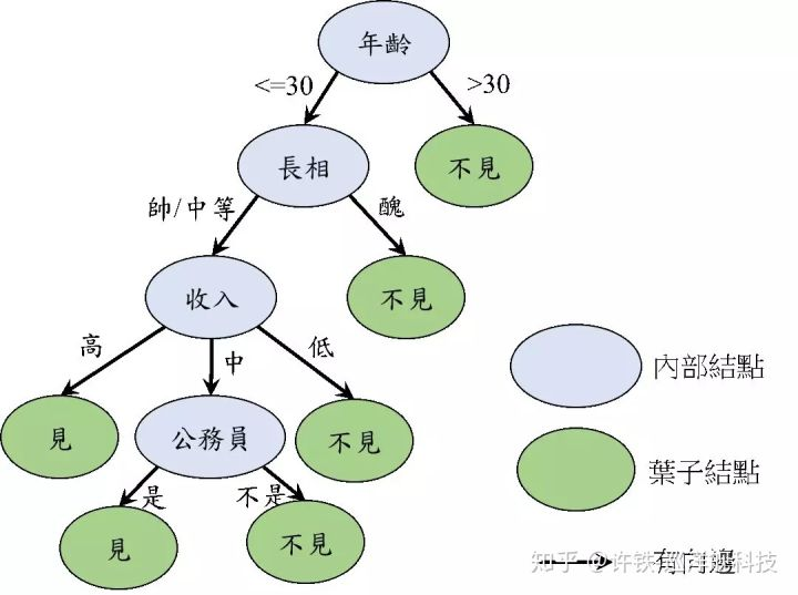 如此,就会形成一个树的结构。构建这个树的主要难点, 在于要由机器决定哪个问题先问, 哪个问题后问, 如何选择这个优先顺序?我的要求就是, 每一次分化,我们都希望取得最多的信息,如分叉后一个树杈全是yes,一个全是no就是最好的效果, 如果达不到, 也让它尽可能接近这个效果。 这样一个一个问题问下去, 最终达到稳定后过程停止。 这样形成的决策树, 我们会形成任何一个情况下的优先级。 或许长的帅的人工资不重要。 或许学历高的人年龄不重要。 这种不同情况不停调整优先级的思维, 真的是被决策树利用到了极致! 从原始数据里提炼的决策树, 可以对无限的新情况进行预测。