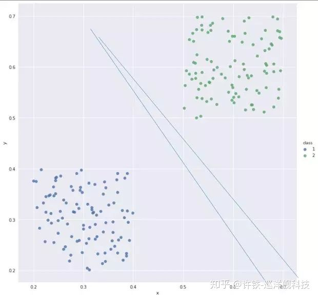 图: 线性分类器, 一条直线代表一组权重, 把两组数据分的越开越好。