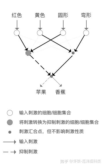 它是怎么做到的呢? 学习。 生物神经网络的学习, 是通过一种叫做hebbian可塑性的性质进行调节的。 这种调控的法则十分简单。说的是神经细胞之间的连接随着它们的活动而变化, 这个变化的方法是, 如果有两个上游的神经元同时给一个共同的下游神经元提供输入, 那么这个共同的输入将导致那个弱的神经元连接的增强, 或者说权重的增强。 这个原理导致的结果是, 我们会形成对共同出现的特征的一种相关性提取。 比如一个香蕉的特征是黄色和长形, 一个猴子经常看到香蕉, 那么一个连接到黄色和长形这两种底层特征的细胞就会越来越敏感, 形成一个对香蕉敏感的细胞,我们简称香蕉细胞。 也就是说我们通过底层特征的“共现” 形成了一个简单的“概念”。 上述过程被总结hebian学习的一个过程。 我们可想象,一个两层以上的神经网络, 就可以表述香蕉, 苹果, 菠萝这些水果了, 它们无非是底层特征颜色,形状的不同组合而已。 而这些不同水果的概念, 就可以帮助我们形成更加复杂的规则表 ,比如让它根据客户的信息帮它推荐一个水果拼盘。 由此可见, 神经网络通过与或非进行简单特征的组合 ,再通过if esle进行判断选择合适的特征得到概念, 再通过下一层迭代得到概念有关的命题。 就可以生成比之前的传统机器学习复杂的多的规则表。而且我们可以想象出来, 迭代的层数越多,它生成的“概念”和“规则”就越复杂。