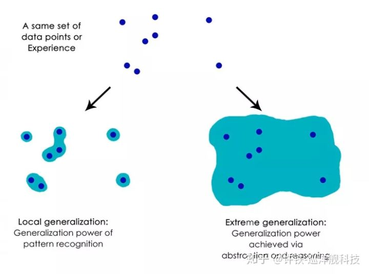 说到所有上述的东西, 你会觉得我们已经无所不能, 既然机器能够自己填写程序, 自己生成规则表来适应多变的世界, 那我们还差什么呢? 我们说都是生成规则, 不同的规则效力差距万千,而目前的AI在此处也就是个小学生。 亚里士多德和牛顿都观测力学现象, 亚里士多德看到的是轻的气体向上飘,重的东西向下沉。 牛顿看到的是受力与加速度的关系。 这两种规则的归纳即使都能解释现象, 但是它们的泛化能力确是千差万别, 一个可以解释全宇宙, 另一个也就适应一些物体吧。 如同下图所示, 坏的规则总结只能解释数据实例周边一丁点的地方, 而好的规则呢, 它可以把点连城片!