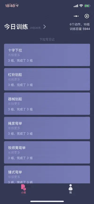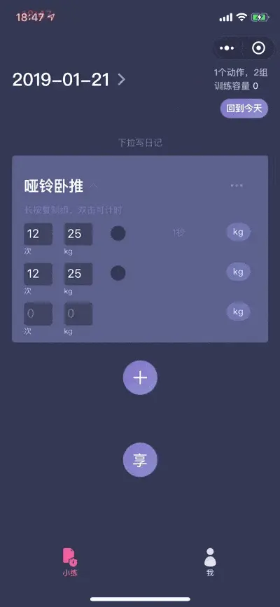 当然,如果你觉得你下一组同样是练的同样的内容,那么输入就太麻烦了。训记+小程序也考虑到了这一点,你可以长按某一组,就可以将动作完全复制下来,无需再手动输入!