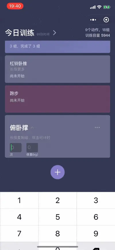 正式开始训练的时候,你可能会忙于各种训练,在记录的时候,当你输入完一组,训记会智能的帮你添加下一组(这一组不会进入统计),为你预留好空格。