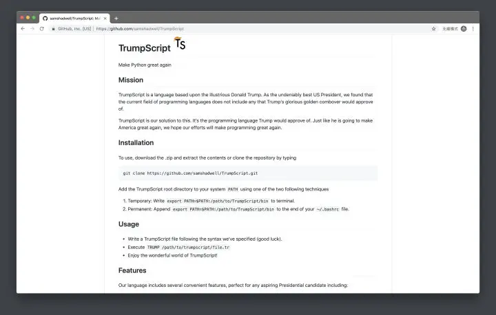 作为有史以来最特立独行的美国总统,川建国同志的一言一行都受到全球瞩目。为了向他致敬,TrumpScript 这款 Python 脚本诞生了。它的语法规则符合特朗普的各种推特习惯:不区分大小写、所有程序必须以 America is great 结尾、拒绝在中国和墨西哥计算机上运行……如果你是川粉,千万不要错过。