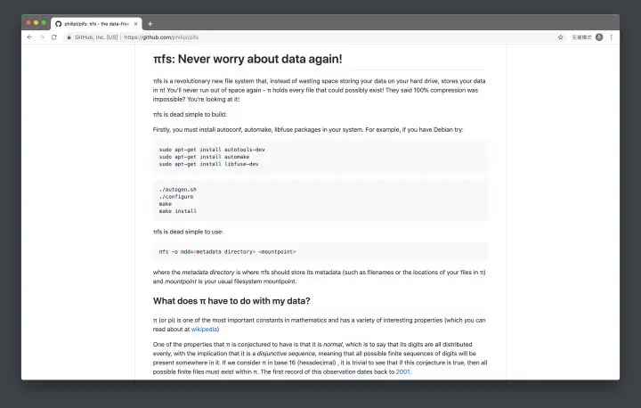 基于这一设想,革命性的 πfs 文件系统 诞生了。它可以将任意文件都转换为两个数字:π 小数点后的起始位数和字节长度,几乎不耗费硬盘空间,唯一的不足之处就是要算出这两个数字大概需要超算运转几亿年了。