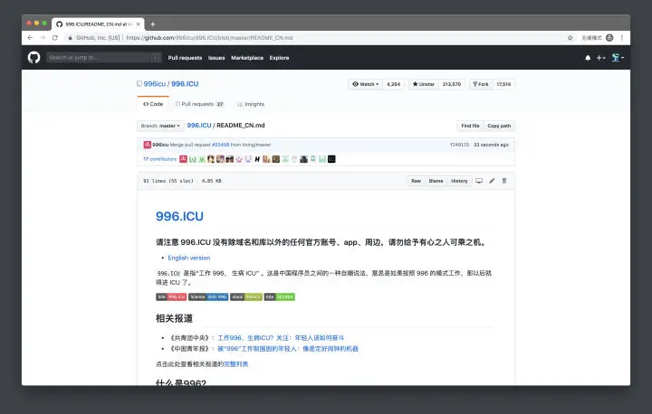 最近 GitHub 上最热门的项目莫过于 996.ICU 了,它在短短数天内就斩获了 21W+ star,成为了 GitHub 有史以来赞数第二高的项目,影响也从程序员圈内波及到了大众范围。