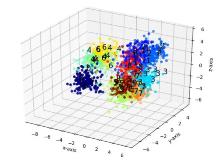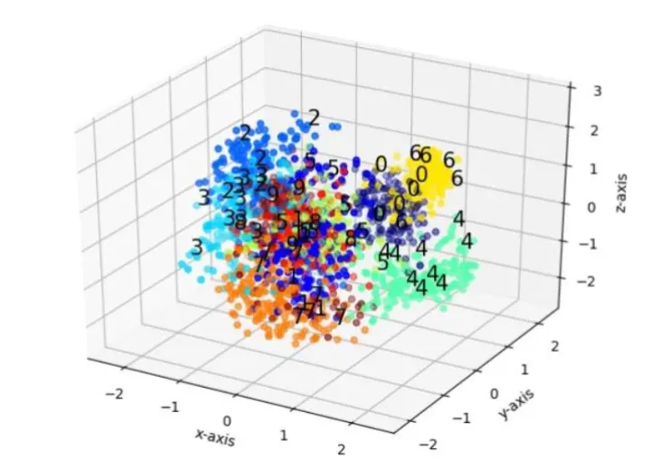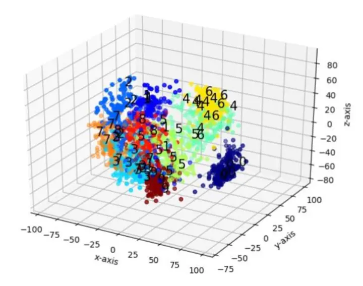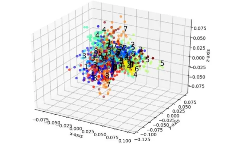 下图是将MNIST数据集投影到3维空间后的结果。